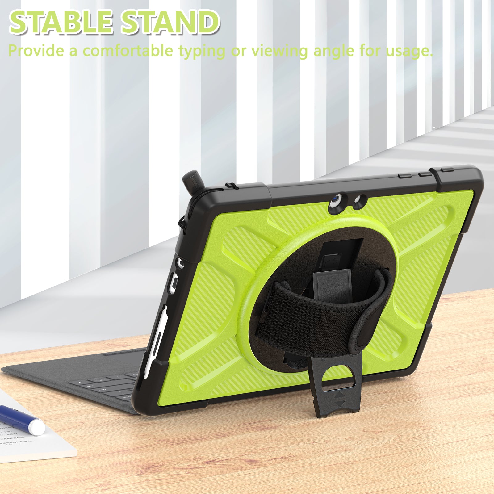 2. 360 rotating stand, nylon velcro hand strap, built-in pencil holder,