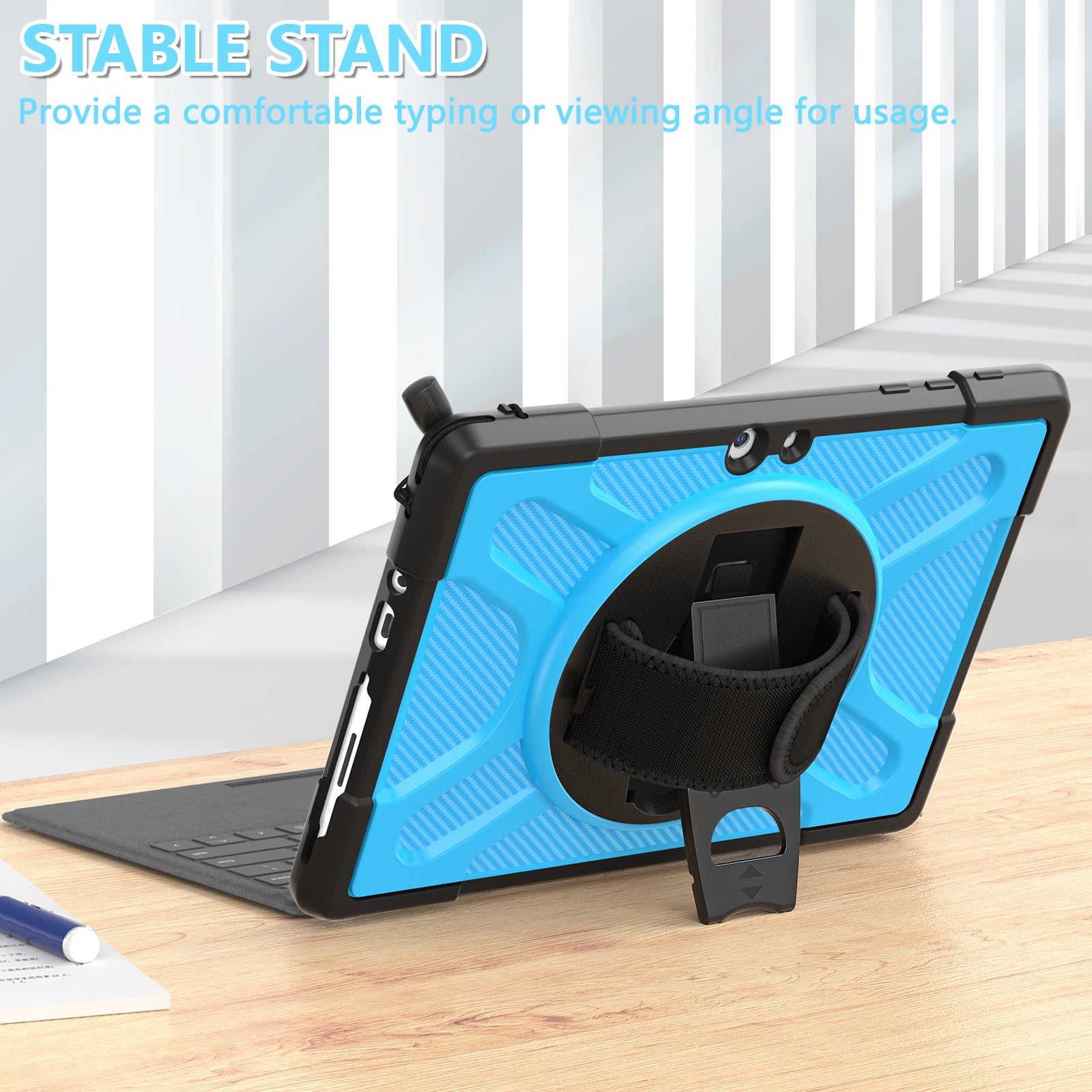 2. 360 rotating stand, nylon velcro hand strap, built-in pencil holder,