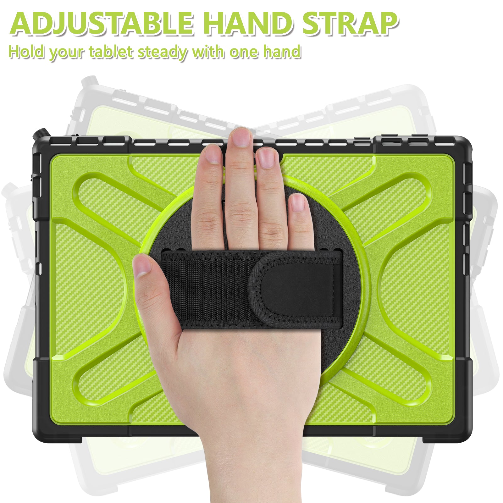 2. 360 rotating stand, nylon velcro hand strap, built-in pencil holder,